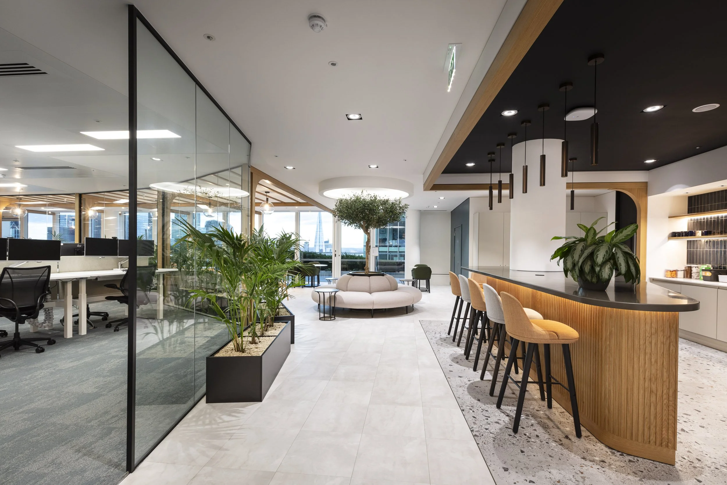 As part of a 2024 fit out for Raymond James, we redesigned the small 20th-floor terrace at their Ropemaker Street office. To counter its weather-dependent use, we brought the outdoors in with a joinery pergola that appears double the size of the terrace’s width to the human eye. Plants, a tree and natural finishes complete the final continuation to the outside. The result is an indoor garden that feels calm, relaxing and can be used year round.